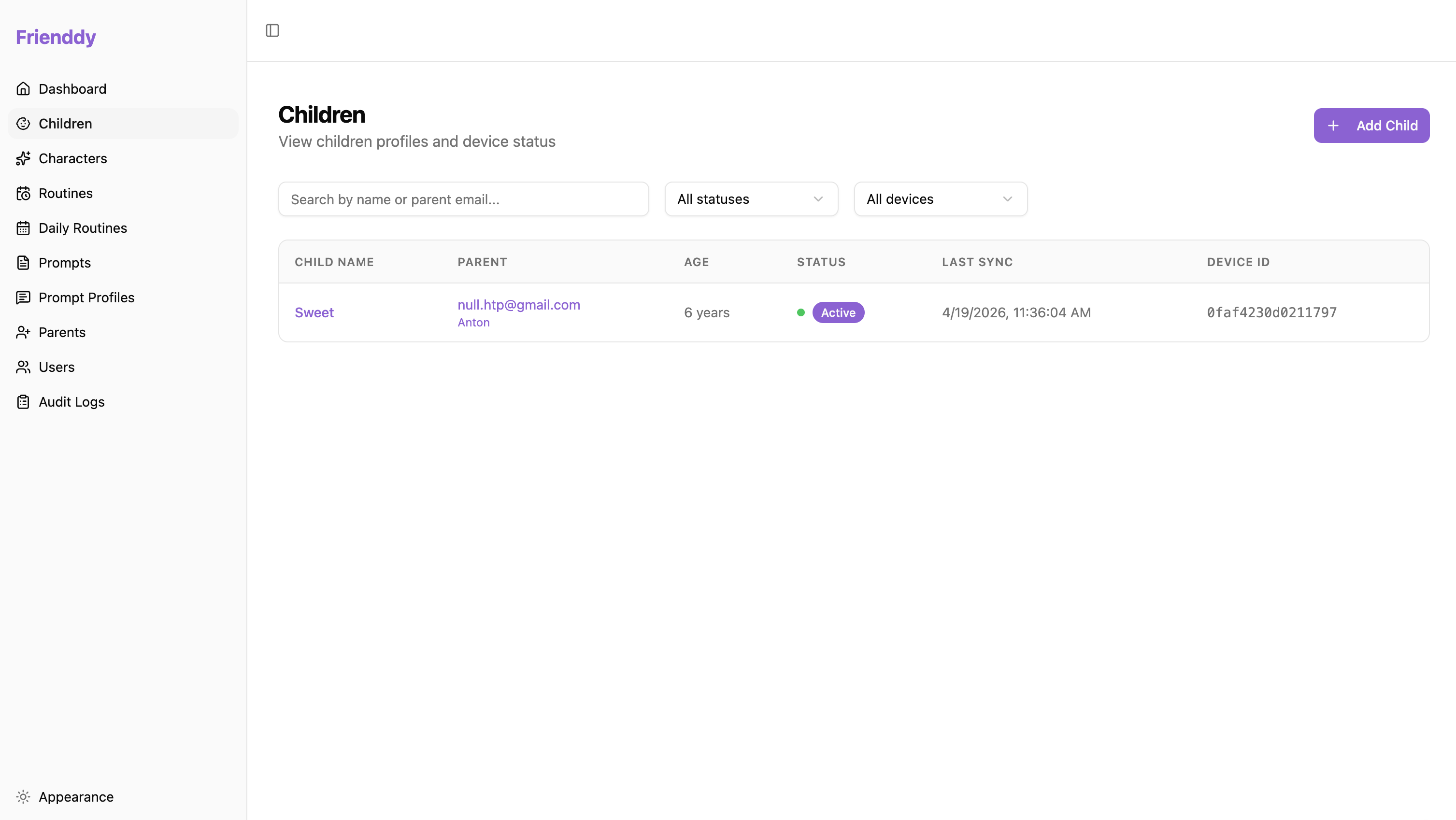 Routine steps and times, quiet hours, reinforcement style, and which results to track. The character is set when the child joins Frienddy — parents don’t change it afterwards, so the child always hears the same familiar voice.